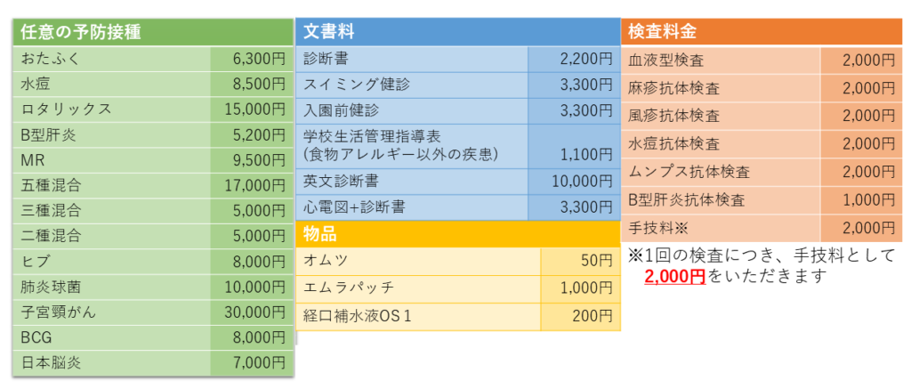 保険診療の対象とならない健康診断、文書の作成、任意の予防接種などについては、下記の料金が発生します