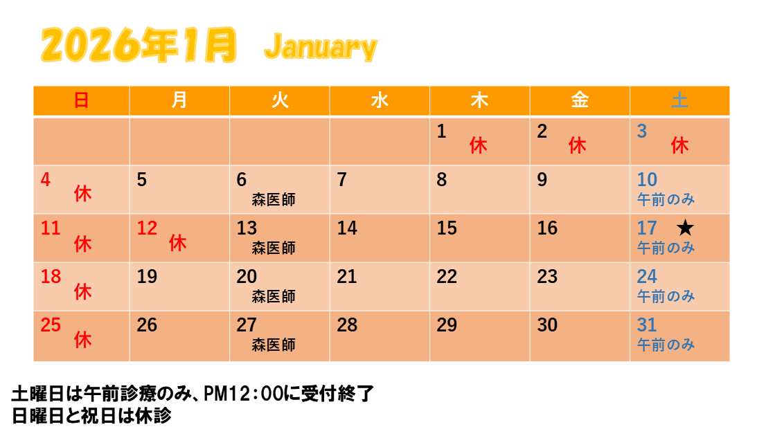 ★1月17日(土)は、会議への出席が予定されているため、森医師が診療を担当いたします。