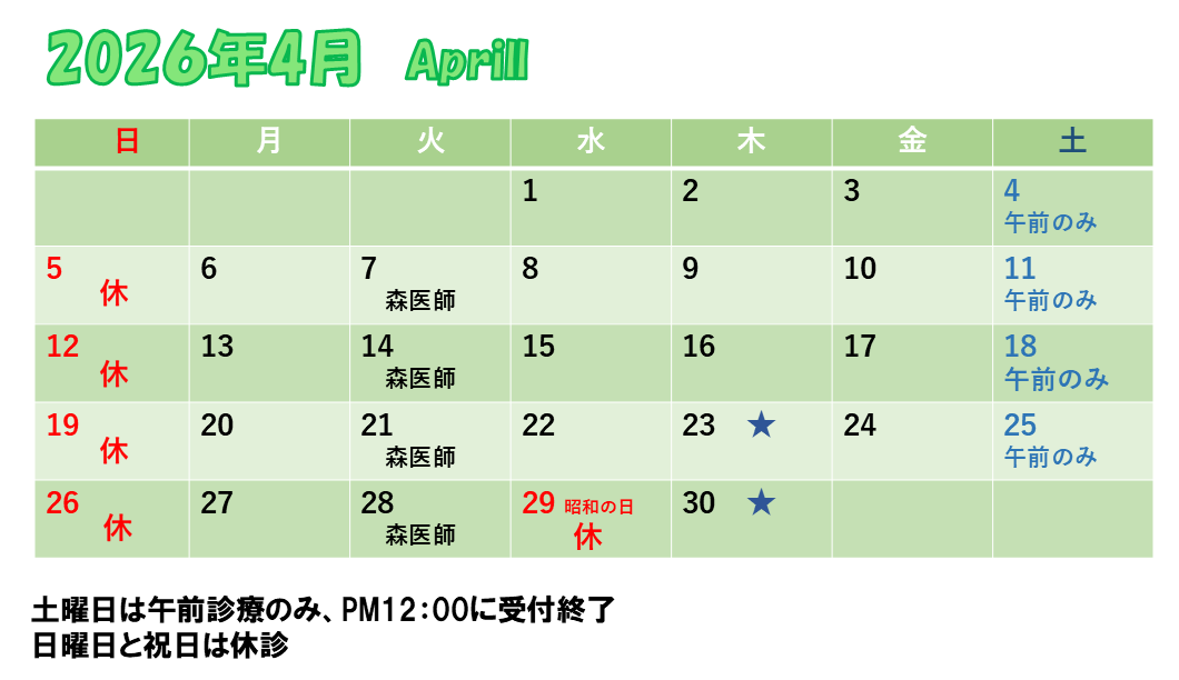 ★学校健診のため、午前診療は9時45分で受付を終了します。午後は通常通り診療いたします。