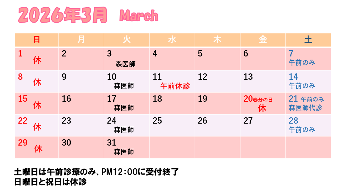 3月21日(土)は、学会出席により森医師が診療を担当いたします。